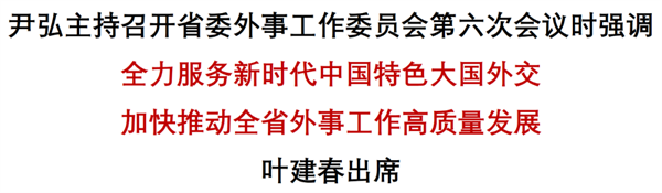 5月15日,省委書記尹弘主持召開省委外事工作委員會第六次會議,他強調(diào),要深入學習貫徹習近平外交思想,按照中央對外戰(zhàn)略部署和省委有關(guān)安排,積極融入國家發(fā)展戰(zhàn)略和全省改革發(fā)展大局,持續(xù)深化對外交流合作,全力服務(wù)新時代中國特色大國外交,加快推動全省外事工作高質(zhì)量發(fā)展。