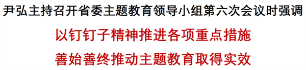 8月16日,省委書記、省委主題教育領(lǐng)導小組組長尹弘主持召開省委主題教育領(lǐng)導小組第六次會議。他強調(diào),要深入學習貫徹習近平總書記重要講話精神和黨中央部署要求,堅持思想不松、標準不降、力度不減,以釘釘子精神推進各項重點措施,善始善終推動主題教育取得實效。