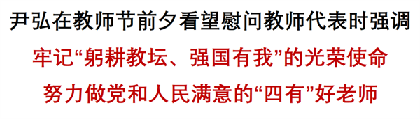 在第39個教師節(jié)到來前夕,9月7日,省委書記、省人大常委會主任尹弘來到部分高校看望慰問教師,代表省委、省政府向全省廣大教師和教育工作者致以節(jié)日祝賀和誠摯慰問。他希望全省廣大教師和教育工作者深入學(xué)習(xí)貫徹習(xí)近平總書記關(guān)于教育的重要論述,堅持以為黨育人、為國育才為根本目標(biāo),牢記“躬耕教壇、強(qiáng)國有我”的光榮使命,堅守三尺講臺,潛心教書育人,努力做黨和人民滿意的“四有”好老師。