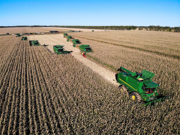9月20日在位于黑龍江雙鴨山市友誼縣的北大荒農(nóng)業(yè)股份有限公司友誼分公司一地塊拍攝的秋收現(xiàn)場(無人機(jī)照片)。