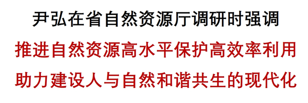3月29日,省委書記尹弘來到省自然資源廳調(diào)研。他強(qiáng)調(diào),要深入學(xué)習(xí)貫徹習(xí)近平總書記關(guān)于自然資源工作的重要論述,聚焦“走在前、勇爭先、善作為”的目標(biāo)要求,圍繞打造“三大高地”、實(shí)施“五大戰(zhàn)略”,扎實(shí)推進(jìn)自然資源高水平保護(hù)高效率利用,助力建設(shè)人與自然和諧共生的現(xiàn)代化,為譜寫中國式現(xiàn)代化江西篇章提供有力支撐。