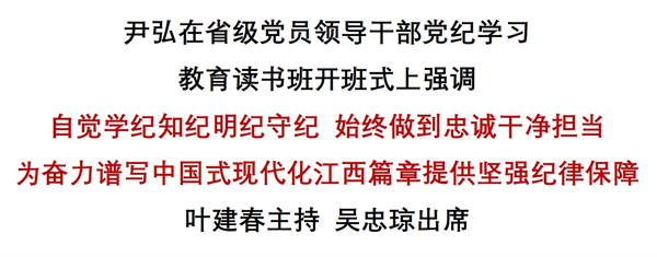 5月6日,省級(jí)黨員領(lǐng)導(dǎo)干部黨紀(jì)學(xué)習(xí)教育讀書班在省委黨校開班。省委書記尹弘出席并在開班式上講話,他強(qiáng)調(diào),要深入學(xué)習(xí)好、領(lǐng)悟透習(xí)近平總書記關(guān)于紀(jì)律建設(shè)的重要論述,充分認(rèn)識(shí)加強(qiáng)紀(jì)律建設(shè)的重大意義,深入開展黨紀(jì)學(xué)習(xí)教育,縱深推進(jìn)全面從嚴(yán)治黨,引導(dǎo)廣大黨員干部自覺學(xué)紀(jì)知紀(jì)明紀(jì)守紀(jì),切實(shí)以黨紀(jì)明方向、立規(guī)矩、正風(fēng)氣、強(qiáng)免疫,始終做到忠誠(chéng)干凈擔(dān)當(dāng),為奮力譜寫中國(guó)式現(xiàn)代化江西篇章提供堅(jiān)強(qiáng)紀(jì)律保障。