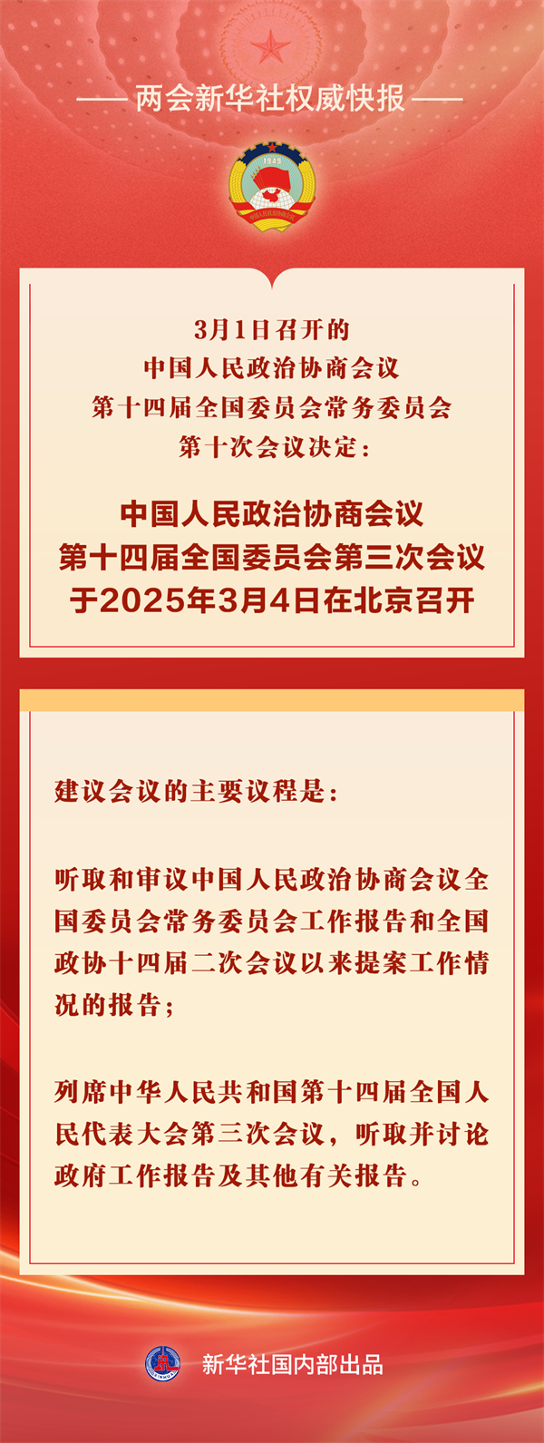 3月1日召開的中國人民政治協(xié)商會議第十四屆全國委員會常務(wù)委員會第十次會議決定:中國人民政治協(xié)商會議第十四屆全國委員會第三次會議于2025年3月4日在北京召開。建議會議的主要議程是:聽取和審議中國人民政治協(xié)商會議全國委員會常務(wù)委員會工作報告和全國政協(xié)十四屆二次會議以來提案工作情況的報告;列席中華人民共和國第十四屆全國人民代表大會第三次會議,聽取并討論政府工作報告及其他有關(guān)報告。