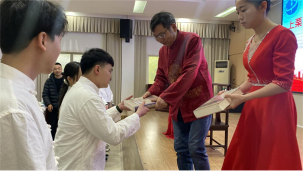 隨后,全國基層名中醫(yī)?李華珍?、江西省名中醫(yī)?許發(fā)明?兩位導(dǎo)師身著唐裝登臺(tái)就座。18名學(xué)術(shù)繼承人?依次向?qū)熜邪輲煻Y、敬茶獻(xiàn)花,導(dǎo)師則回贈(zèng)中醫(yī)典籍,象征技藝與仁心的雙重托付。繼承人代表鏗鏘表態(tài):“必當(dāng)勤學(xué)篤行,不負(fù)師恩!”全場掌聲雷動(dòng),師徒合影定格這一薪火相傳的珍貴時(shí)刻。