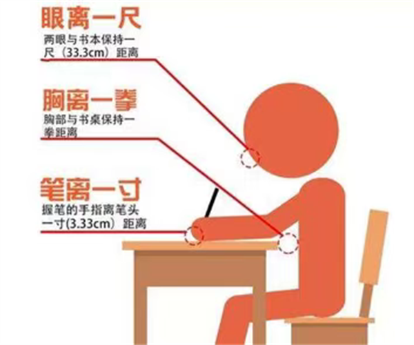 持續(xù)、近距離用眼易誘導近視形成。閱讀時,要保持合理近處用眼距離,建議大于30厘米用眼,相對越遠對眼睛越好。書寫姿勢建議做到“一尺一拳一寸”,即眼與書本的距離要保持一尺以上,身體與課桌之間保持一個拳頭的距離,握筆時手指尖和筆尖要保持一寸的距離。連續(xù)用眼20分鐘,建議休息遠眺幾分鐘,即“3個20”,近距離用眼20分鐘,向20英尺外(約6米),抬頭遠眺至少20秒以上。