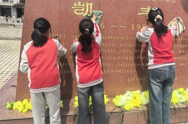孩子們擦拭墓碑上的塵埃、敬獻(xiàn)花圈