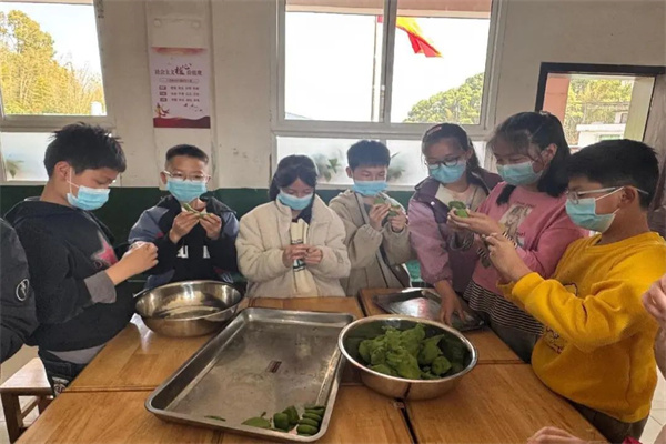 ▲老關(guān)鎮(zhèn)登官小學(xué)的學(xué)生制作出一個(gè)個(gè)圓潤的艾葉粑粑