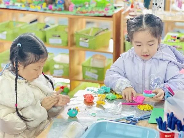 ▲湘東區(qū)第二幼兒園大(2)班用黏土制作五彩青團(tuán)