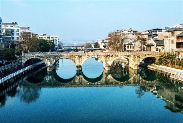這石橋全長(zhǎng)68米、寬7.8米,跨水面為五個(gè)石砌半圓孔,浮出水面約七八米,遠(yuǎn)觀靈秀輕盈,近瞻傲然蒼勁。其橋面由長(zhǎng)條麻石鋪就,橫直相間,既講究力學(xué)結(jié)構(gòu),更體現(xiàn)建筑設(shè)計(jì)對(duì)美學(xué)的追求,行走上面,有穿越長(zhǎng)長(zhǎng)的時(shí)光隧道之感,那種手工時(shí)代打磨之精細(xì)與人力之偉大,使你用足跡丈量足可體味。尤經(jīng)人來(lái)車往常年碾壓的痕跡深嵌其上,對(duì)歷史人文的承載讓你油然而生敬仰。