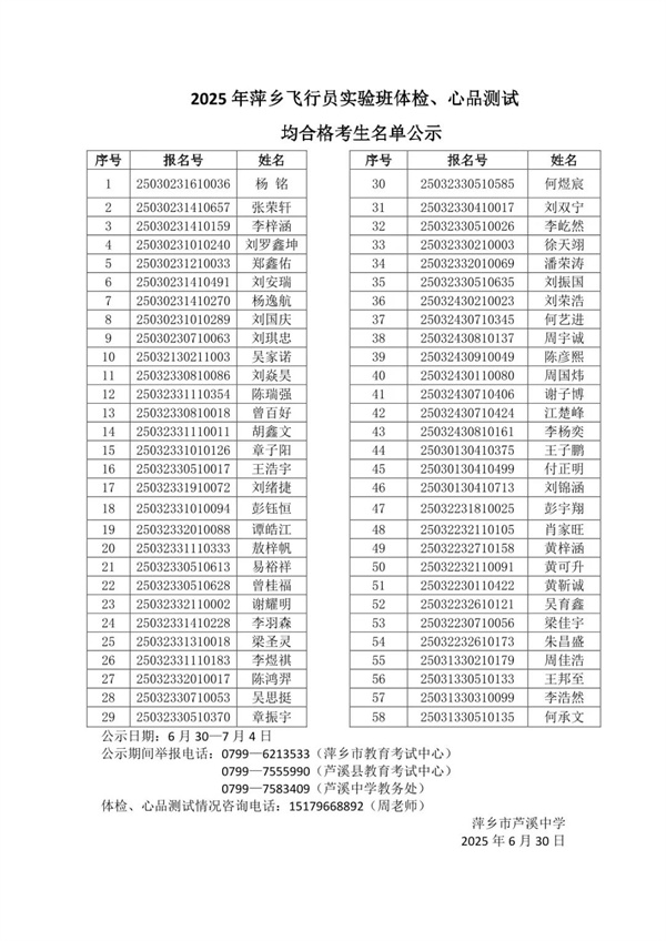 各位報名并參加了2025年萍鄉(xiāng)飛行員實驗班體檢及心品測試的初三畢業(yè)生: