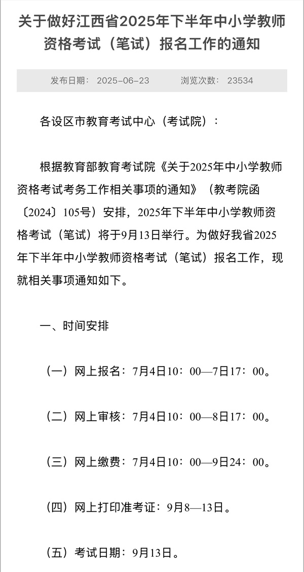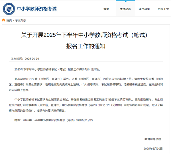近日,教育部教育考試院發(fā)布通知,明確2025年下半年中小學教師資格考試(筆試)報名工作將于7月4日開始。