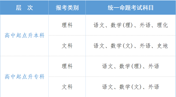 (一)高中起點(diǎn)升本科、??瓶荚嚢次目啤⒗砜品謩e設(shè)置統(tǒng)考科目。公共課統(tǒng)考科目均為語文、數(shù)學(xué)、外語三門,其中數(shù)學(xué)分文科類、理科類兩種,外語分英語、日語、俄語三個(gè)語種,由考生根據(jù)報(bào)考學(xué)校招生專業(yè)要求選擇語種。報(bào)考高中起點(diǎn)升本科的考生,除參加三門統(tǒng)考公共課的考試外,還需參加專業(yè)基礎(chǔ)課的考試,理科類專業(yè)基礎(chǔ)課為“物理、化學(xué)”(簡稱理化),文科類專業(yè)基礎(chǔ)課為“歷史、地理”(簡稱史地)。