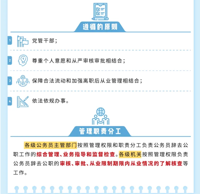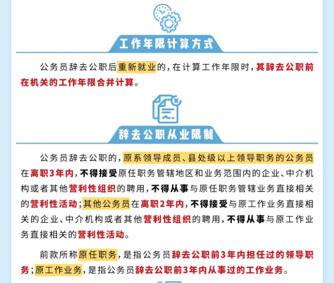 公務(wù)員辭去公職的,原系領(lǐng)導(dǎo)成員、縣處級(jí)以上領(lǐng)導(dǎo)職務(wù)的公務(wù)員在離職3年內(nèi),不得接受原任職務(wù)管轄地區(qū)和業(yè)務(wù)范圍內(nèi)的企業(yè)、中介機(jī)構(gòu)或者其他營(yíng)利性組織的聘用,不得從事與原任職務(wù)管轄業(yè)務(wù)直接相關(guān)的營(yíng)利性活動(dòng);其他公務(wù)員在離職2年內(nèi),不得接受與原工作業(yè)務(wù)直接相關(guān)的企業(yè)、中介機(jī)構(gòu)或者其他營(yíng)利性組織的聘用,不得從事與原工作業(yè)務(wù)直接相關(guān)的營(yíng)利性活動(dòng)。