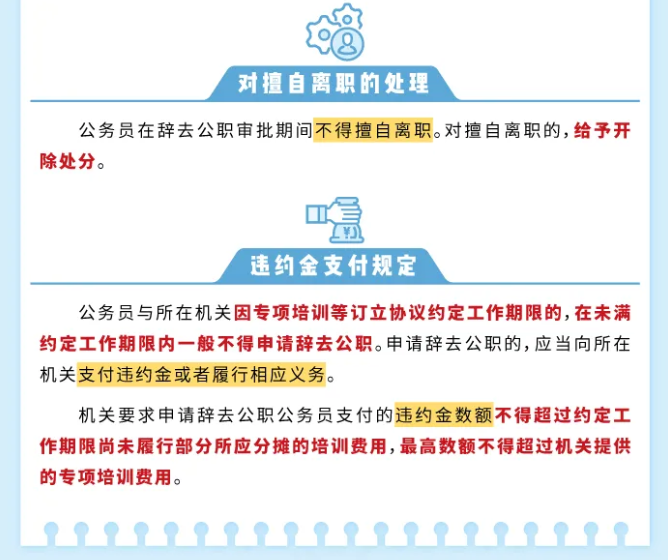 公務(wù)員與所在機(jī)關(guān)因?qū)m?xiàng)培訓(xùn)等訂立協(xié)議約定工作期限的,在未滿約定工作期限內(nèi)一般不得申請(qǐng)辭去公職。申請(qǐng)辭去公職的,應(yīng)當(dāng)向所在機(jī)關(guān)支付違約金或者履行相應(yīng)義務(wù)。