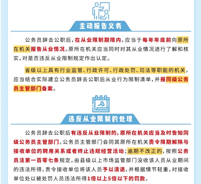 公務(wù)員辭去公職后,在從業(yè)限制期限內(nèi),應(yīng)當(dāng)于每年年底前向原所在機(jī)關(guān)報(bào)告從業(yè)情況。原所在機(jī)關(guān)應(yīng)當(dāng)同時(shí)對(duì)其從業(yè)情況進(jìn)行了解和核實(shí),對(duì)是否違反從業(yè)限制規(guī)定作出認(rèn)定。