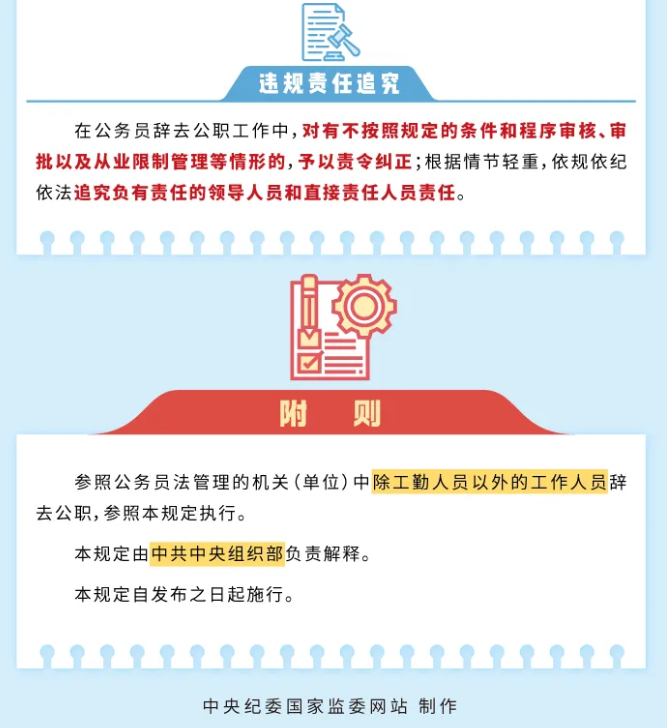 公務(wù)員辭去公職后有違反從業(yè)限制的,原所在機(jī)關(guān)應(yīng)當(dāng)及時(shí)告知同級(jí)公務(wù)員主管部門。公務(wù)員主管部門會(huì)同其原所在機(jī)關(guān)責(zé)令限期解除與接收單位的聘用關(guān)系或者終止違規(guī)經(jīng)營(yíng)活動(dòng);逾期不改正的,按照公務(wù)員法第一百零七條規(guī)定,由縣級(jí)以上市場(chǎng)監(jiān)管部門沒(méi)收該人員從業(yè)期間的違法所得,責(zé)令接收單位將該人員予以清退,并根據(jù)情節(jié)輕重,對(duì)接收單位處以被處罰人員違法所得1倍以上5倍以下的罰款。