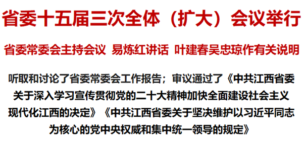 11月22日,中共江西省委十五屆三次全體(擴(kuò)大)會(huì)議在南昌召開。 省委常委會(huì)主持會(huì)議。省委書記易煉紅受省委常委會(huì)委托作了工作報(bào)告和講話。 全會(huì)聽取和討論了省委常委會(huì)工作報(bào)告;審議通過了《中共江西省委關(guān)于深入學(xué)習(xí)宣傳貫徹黨的二十大精神加快全面建設(shè)社會(huì)主義現(xiàn)代化江西的決定》和《中共江西省委關(guān)于堅(jiān)決維護(hù)以習(xí)近平同志為核心