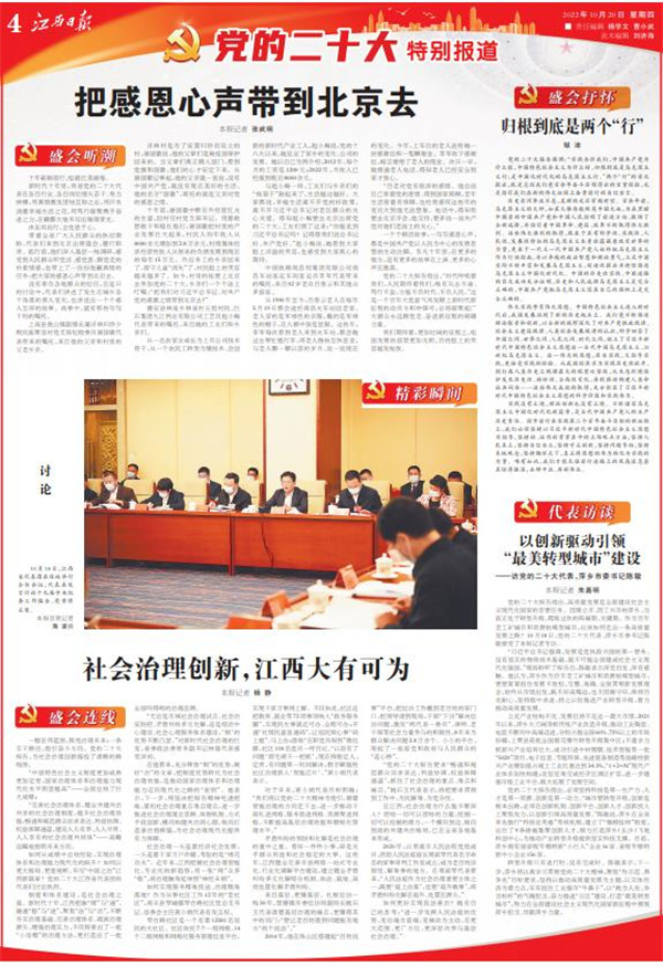在潛心研讀中領(lǐng)悟精神,在學(xué)習(xí)討論中鼓足干勁。連日來,黨的二十大江西省代表團代表踴躍發(fā)言,結(jié)合工作實際暢談學(xué)習(xí)黨的二十大報告的深刻體會。代表們說,黨的二十大報告系統(tǒng)擘畫了以中國式現(xiàn)代化推進中華民族偉大復(fù)興的宏偉藍(lán)圖,是全黨全國各族人民奮進新征程、建功新時代的綱領(lǐng)性文獻。大家一致表示,作為十年偉大變革的親歷者、見證者、參與者,深感榮幸與自豪。立足新時代新征程,將深入學(xué)習(xí)宣傳貫徹黨的二十大精神,以更加飽